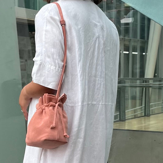 Introducing our handmade Bonbon drawstring bag in a stunning vintage pink suede...
